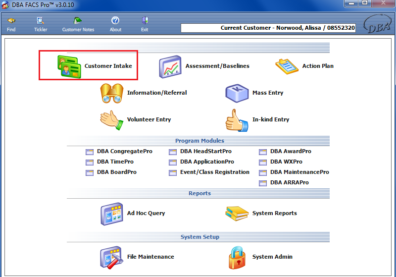 This will take you to the Main Menu. Open the address screen by clicking on the Customer Intake icon. NOTE: If the Address screen is already up and you search for a different customer and double click on their name, the Address screen will remain, but with the second customer's information instead of the first customer's. |