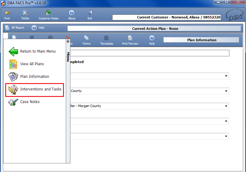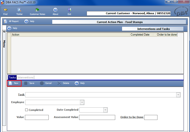 This will take you to the Interventions and Tasks screen, where interventions and tasks are entered and may be viewed. To activate the bottom half of the screen, click the New icon. You may now enter your Task. Tasks and Interventions will be automatically added if the Action Plan was added through the Program Calculator or by using a Template. |