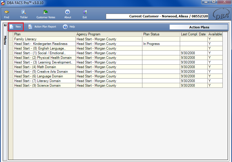 The Action Plans screen is where all previous Action Plans are featured in a table. If you wish to enter a new Action Plan, simply click on the New icon. If your state utilizes the Program Calculator you won't use this step because the Program Calculator will create the Action Plan for you automatically as long as the customer is eligible. |