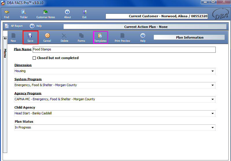 If your state does not utilize the Program Calculator, you can hit the Template button on the toolbar to view Action Plan templates for the program you are trying to enroll the customer in. This will fill in the Dimension and System Program automatically and also create the Tasks and Interventions setup for this Action Plan. |