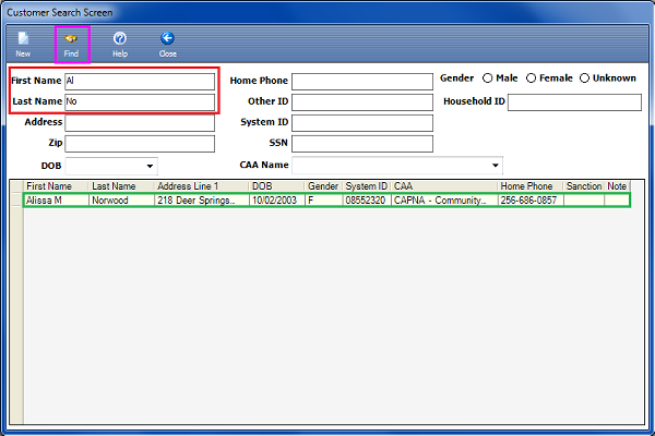 This will bring up the Customer Search Screen, where the user may enter search criteria to search for a customer.Fill in the first letter of the first name and first 3 letters of the last name so the search criteria isn't too broad or too narrow. If you aren't sure if someone is in the system already, do not search by SSN# because someone else may have entered an incorrect SSN# and then a duplicate customer could be created. Once the criteria have been entered, click the Find icon once more to search the system. After the search results have come up, double click the appropriate customer. |